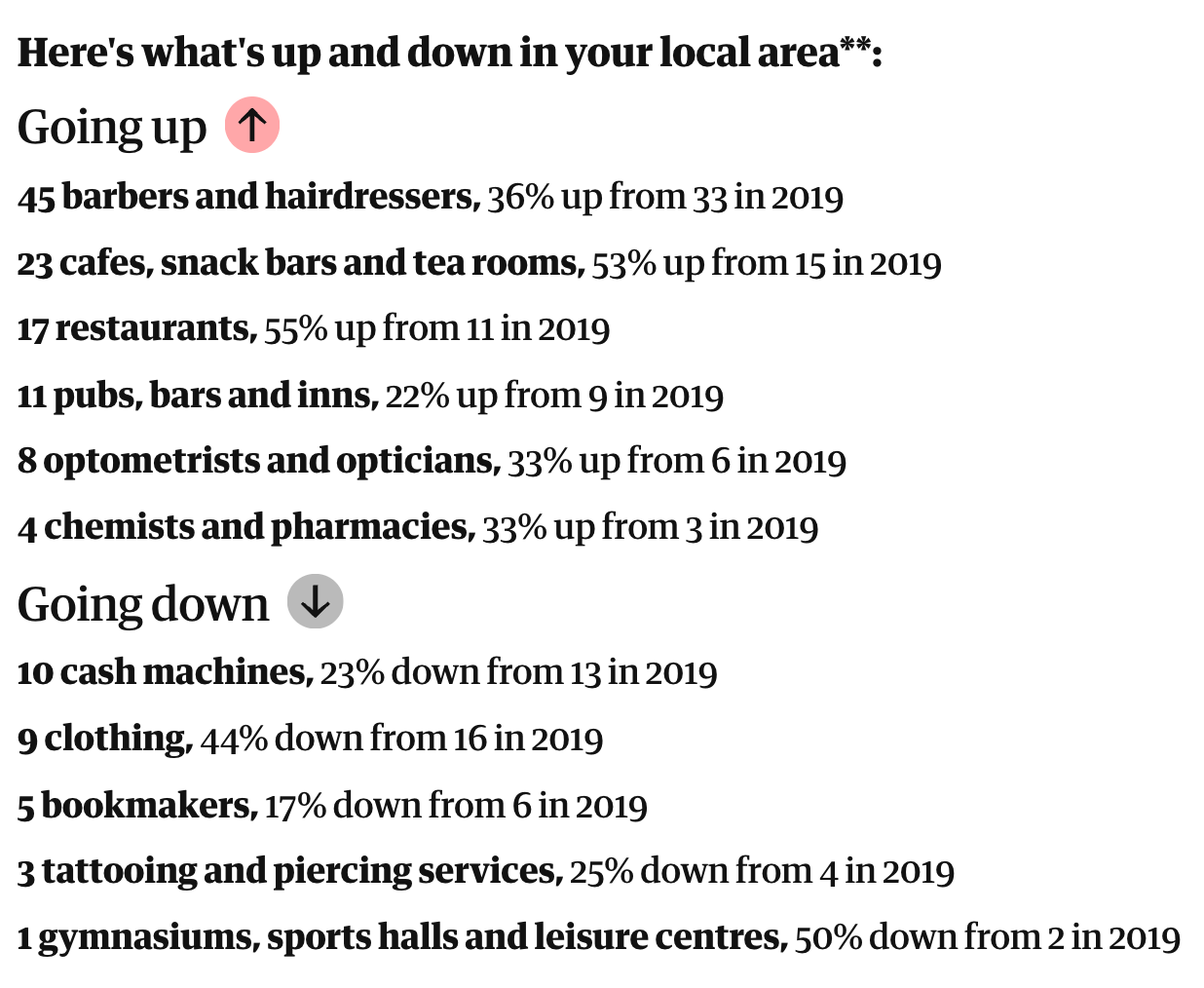 The last six years have coincided with a series of shocks to the economy. Lockdowns during the Covid pandemic disrupted footfall and accelerated online retail, while Brexit, energy bill hikes, a cost of living crisis and national changes to wages and employer tax contributions have piled further pressure on both independent businesses and national chains. What remains on Britain’s high streets – and what has disappeared – offers a snapshot of how the country shops, eats and spends its time.
